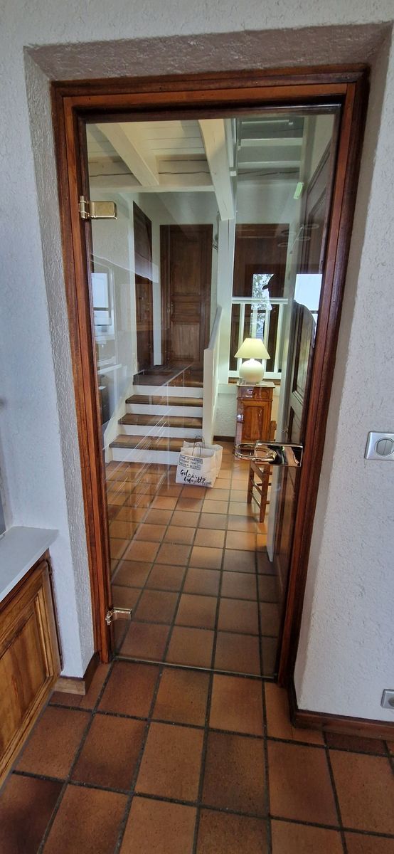 Porte vitrée avec des bandes opaques donnant sur une cuisine