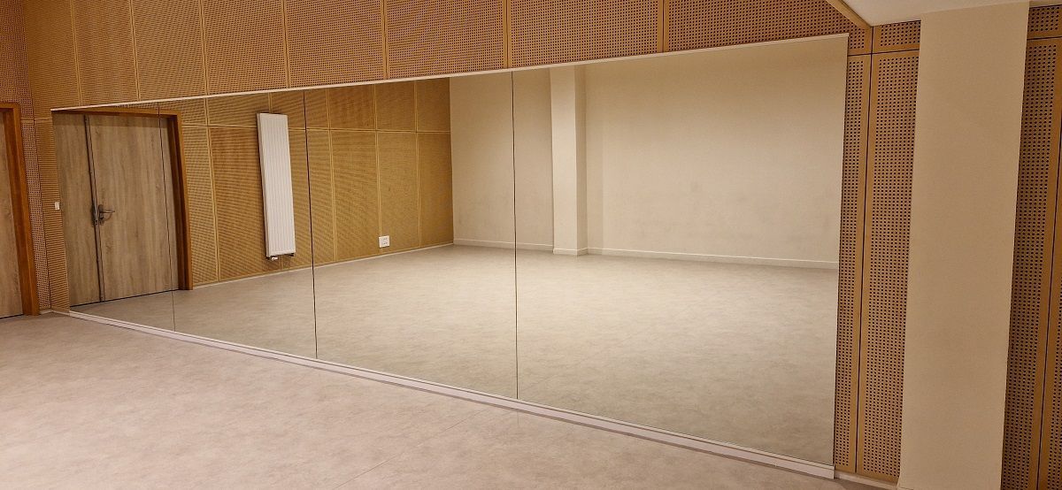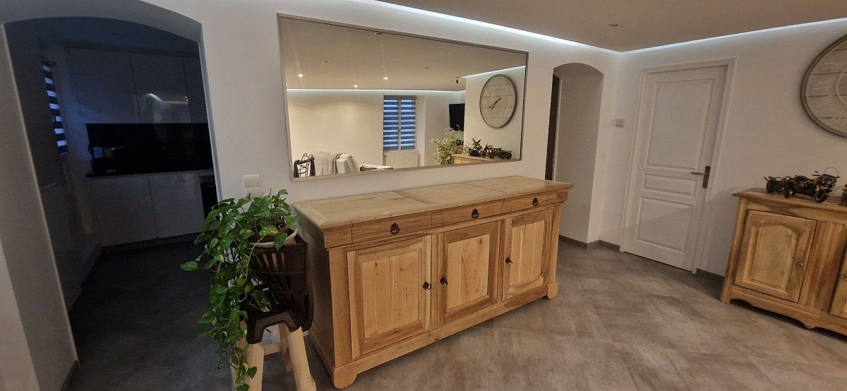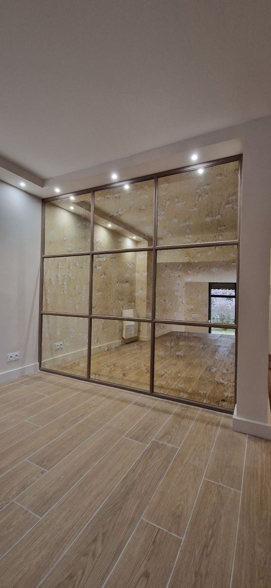 Pose d'un ensemble de miroirs posés avec des profils blancs sur le haut et bas des miroirs.
